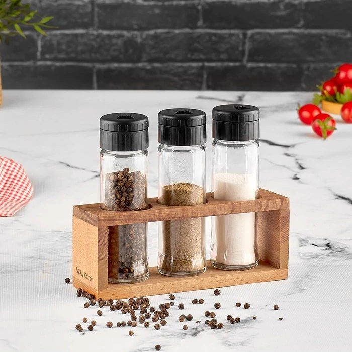 Készlet tartalma: 3 darab üveg fűszertartó, 1 darab fa fűszertartóállvány