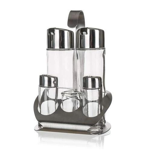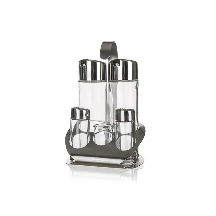 CULINARIA ízesítő készlet 6 db, háztartási és vendéglátó-ipari felhasználásra is alkalmas. Tető: rozsdamentes acél 18/8, PP műanyag és szilikontömítés, acél vastagsága 0,40 mm, tárolók: üveg, állvány: rozsdamentes acél 18/0, alap: 1,00 mm, fogantyú 1,5 mm.