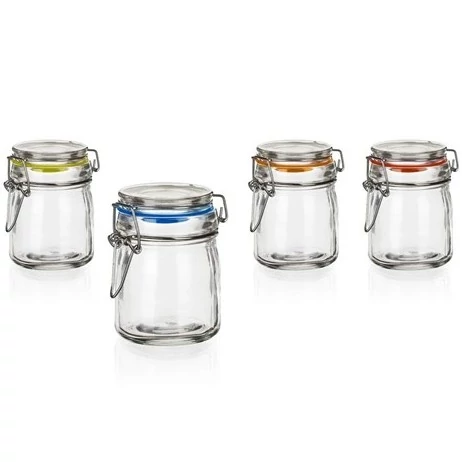 Az üveg tároló szorosan záródó dekoratív tetővel van ellátva.