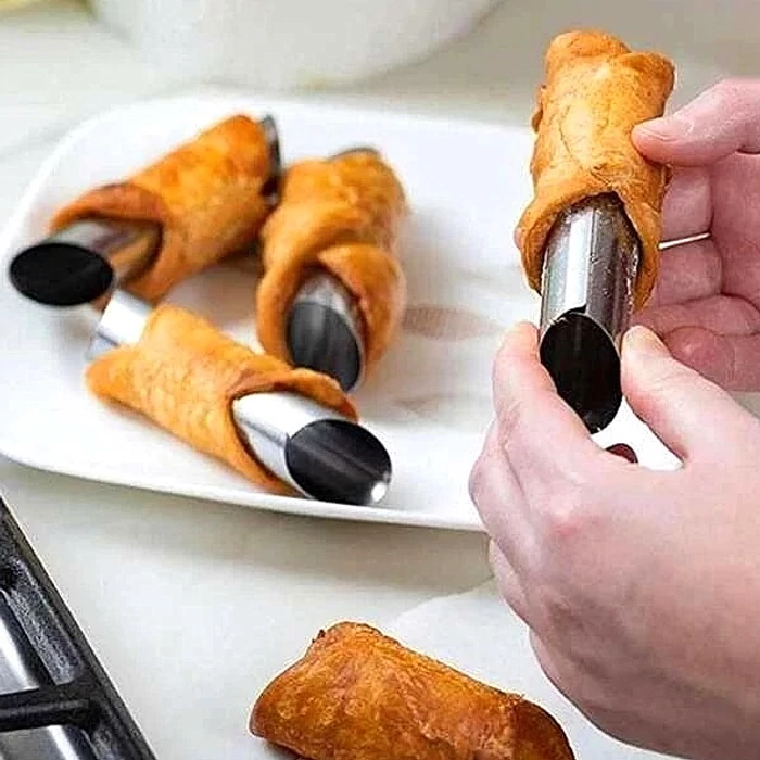 Használata: A leveles tésztát vékonyra nyújtjuk, 1 cm-es csíkokat vágunk és a mini tekercsre felcsavarjuk úgy, hogy a csíkok szélei fedjék egymást. Úgy helyezzük a sütőlemezre, hogy a végek alulra kerüljenek. Forró sütőben, erős lángon pirosra sütjük. Még melegen lehúzzuk a formákat úgy, hogy tenyerünkkel átfogjuk a tekercset és másik kezünkkel a formát megcsavarva a tésztából kihúzzuk. A tekercset kihűtjük, és sajtos besamellel / tejszínes sonkával / darált húsos töltelékkel / pudinggal megtöltjük.