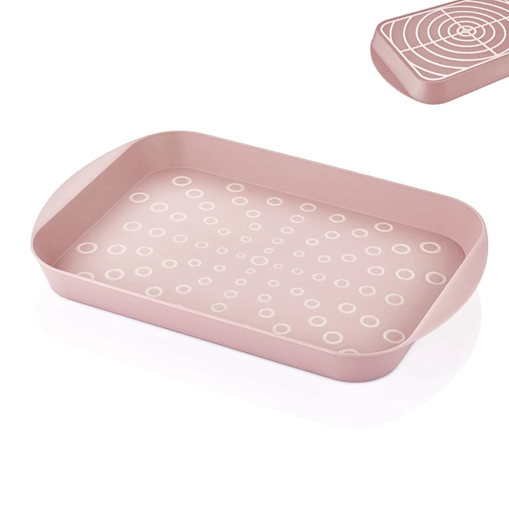 A szilikontalpas műanyag tálca úgy a tálca alsó részén, mint annak az alján csúszásgátló felületkezeléssel van ellátva.