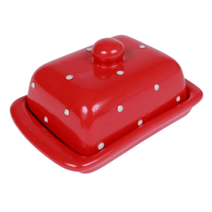 Vajtartó, piros alapon, fehér pöttyös motívummal díszített piros-fehér mázas búra, tálcával