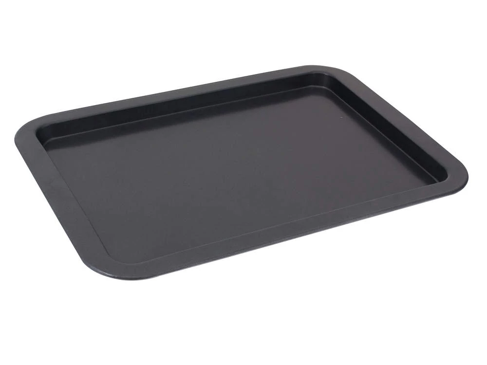 A 43 x 29 cm méretű CUISINO tepsi különböző ételek sütésére használható. A tepsi anyaga: tapadásmentes felülettel bevont szénacél, vastagsága 0,4 mm, külső oldala sötétszürke kivitelű, tepsi magassága 1,7 cm.