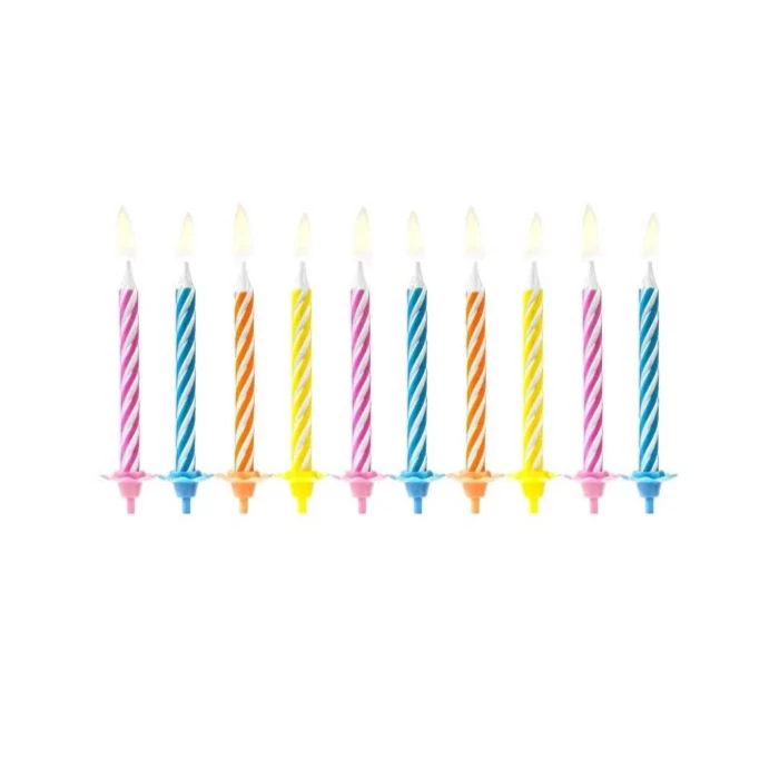 Születésnapi különböző színű spirálos gyertyakészlet. A készlet tartalma: 24 db gyertya, 24 db műanyag leszúró. Méret: gyertya 5 x 0.3 cm.