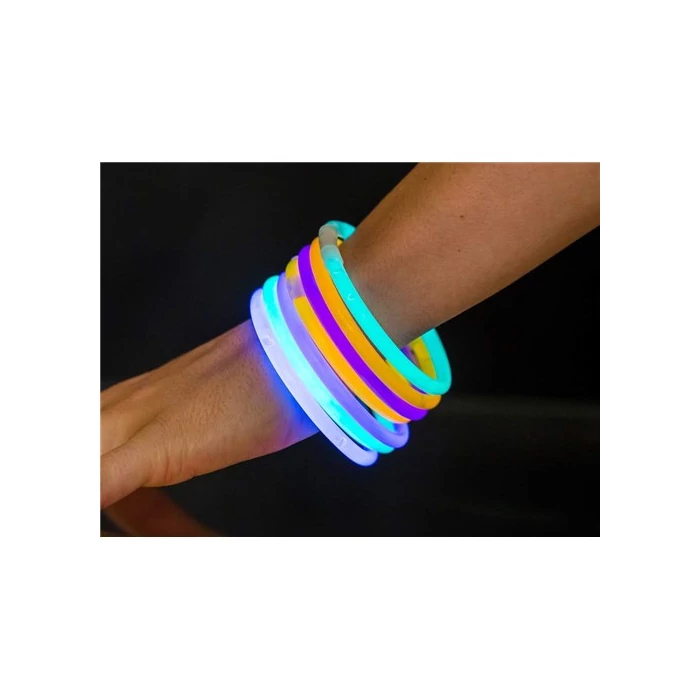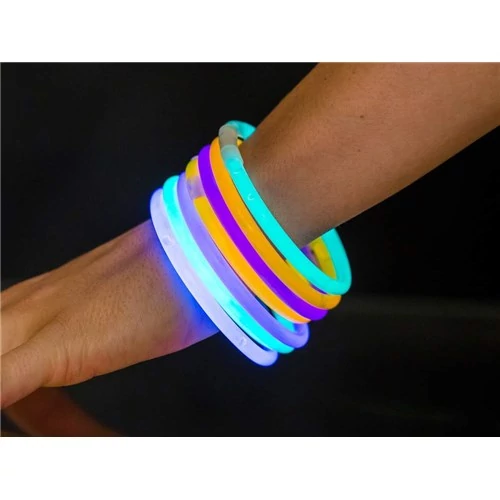 Világító karkötő készlet, 25 db/tubus, karkötők mérete 5 mm x 20 cm. Csomagban található színek: zöld, narancssárga, kék, sárga és piros. A karkötőt egyszerűen csak meg kell hajlítani, és máris kb. 4 órán keresztül világít.