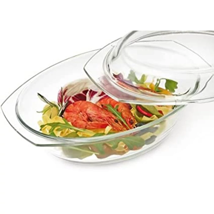Ovális üveg pecsenyesütő fedővel, mechanikus és hőhatásokkal szemben rendkívül ellenálló kemény boroszilikát üvegből készül, melynek hőmérséklet-tartománya -40 és +300 C között van. Előnye, hogy tartós, higiénikus és könnyen karbantartható (mosogatógépben mosható).