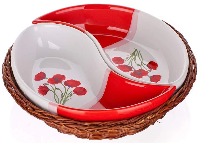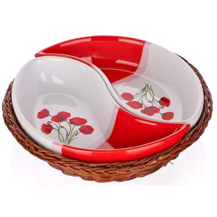 Kétrészes POPPY kerámiatálka készlet fonott kosárban 20,3 cm. Piros-fehér mázas pipacs mintával díszített kerámia, különböző összeállításban készül.