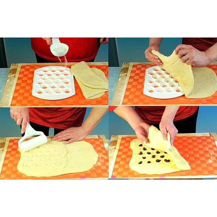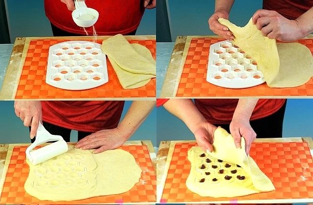 A tésztát kinyújtjuk, kétszer nagyobbra, mint a forma. A felét ráhelyezzük a sablonra és gyengén rányomjuk, amíg a töltelék helye látszik. Ezután megtöltjük, majd rátesszük a tészta másik felét. Hengereljük át, amíg a tészta el nem válik. A formát megfordítjuk és kipotyogtatjuk vagy kinyomkodjuk a tésztát. Forrásban lévő sós vízbe kifőzzük, ha édes, akkor sütőbe helyezzük.
