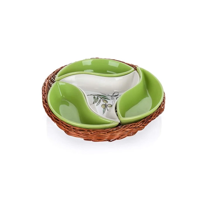 OLIVES tál fonott kosárban 23cm, fonott kosárba helyezett 4 részes tál, 21,6cm, tartalma: 3x kisméretű tálka, 1x nagyméretű tálka, 1x fonott kosár. Közkedvelt olíva motívumos kerámia kollekcióba tartozik, a széles termékválasztékból tovább bővíthető.