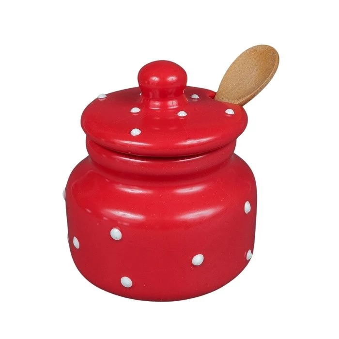 Ez a bájos, piros alapon fehér pöttyös kerámia mézescsupor ideális választás méz tárolására és tálalására.
