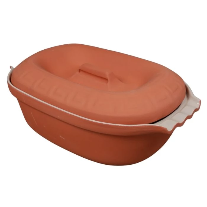 Használata: az edényt első alkalommal 30 percig, további sütés alkalmával 15-60 percig hideg vízben áztassa. Az edényt mindig hideg sütőbe, rácsra tegye, és fokozatosan melegítse a kívánt sütési hőmérsékletre. A forró edényt ne hűtse hirtelen, fa deszkára, hőálló alátétre vagy száraz ruhára helyezze!