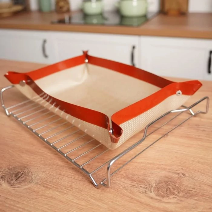 A sütőlap hőállósága -40 °C és +230 °C között garantálja, hogy akár fagyasztóban, akár sütőben használható. Egyedülálló felcsatolható széleinek köszönhetően könnyedén összecsukható vagy kiterjeszthető, így kompakt és praktikus tárolást biztosít. Csúszásgátló kialakítása miatt stabilan a helyén marad használat közben, ezáltal növeli a biztonságot és a kényelmet a konyhában. Többször használható, így környezetbarát választás, amely hosszú távon is kiváló szolgálatot tesz mindennapi sütési és főzési feladatok során. Ez a sütőlap tökéletes választás mindazok számára, akik praktikus, strapabíró és egészséges megoldást keresnek a konyhában.