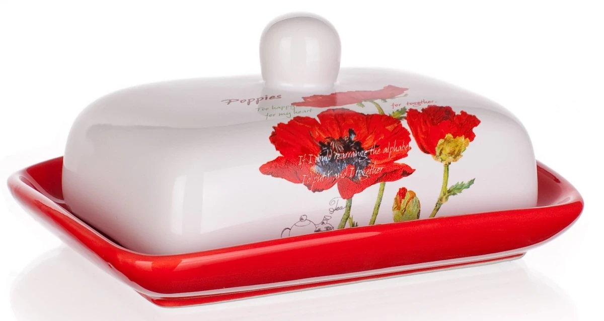 POPPY Red vajtartó, pipacs motívummal díszített piros-fehér máz, anyaga - kerámia, méretek: hosszúság 17,5 cm, szélesség 13 cm, magasság 8 cm.