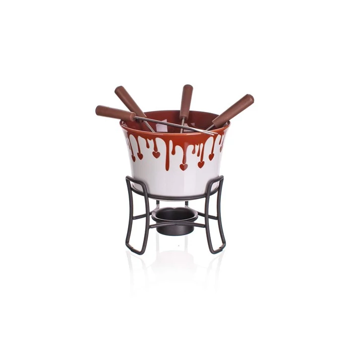 Hatrészes CHOCO DARK csokoládé fondue szett: 1x kerámiatál átmérője 11,5 cm, magassága 7,5 cm, 1x teamécsestartó állvány magassága 8 cm, 4x villa - hosszúsága 15 cm, anyaga rozsdamentes acél + PP.