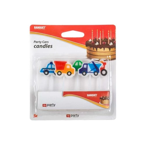 Az AUTÓK motívumos születésnapi gyertya készlet 5 db különbözőképpen színezett AUTÓ motívumos gyertyát tartalmaz.