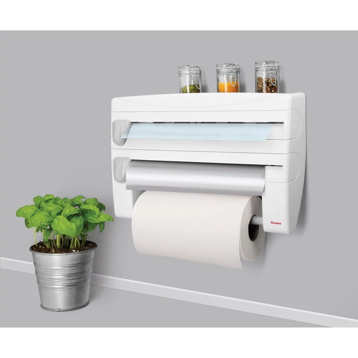 Roll& Roll 4 az 1-ben falra szerelhető konyhai fóliatépő, alufólia-, papírtörlő tartó a teteje fűszertartóként használható. A felszereléséhez szükséges rögzítőt a doboz tartalmazza. Csomagolás minden fel és összeszereléshez szükséges információt tartalmaz. Anyaga műanyag.