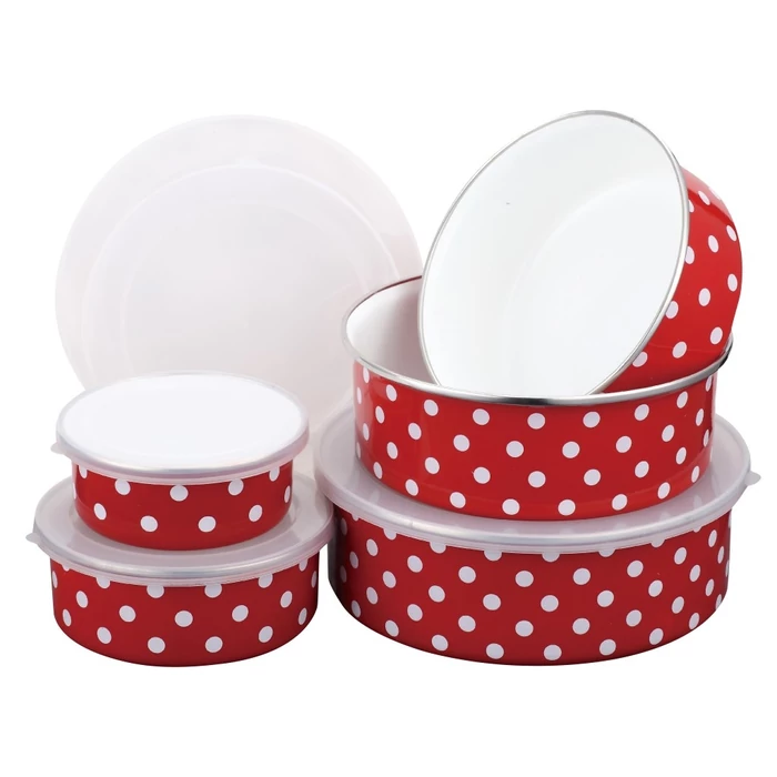 Praktikus és stílusos megoldás ételeid tárolására! A Pöttyös tárolóedény szett 10 részes készlet 5 zománcos tálból és 5 tökéletesen illeszkedő műanyag fedőből áll, amelyek biztosítják az ételek frissegen tartását és könnyű szállítását. A vidám pöttyös mintázat miatt a konyhában is hangulatos kiegészítőként szolgál. Tartós zománc felületének köszönhetően egyszerűen tisztítható és hosszú élettartamú.