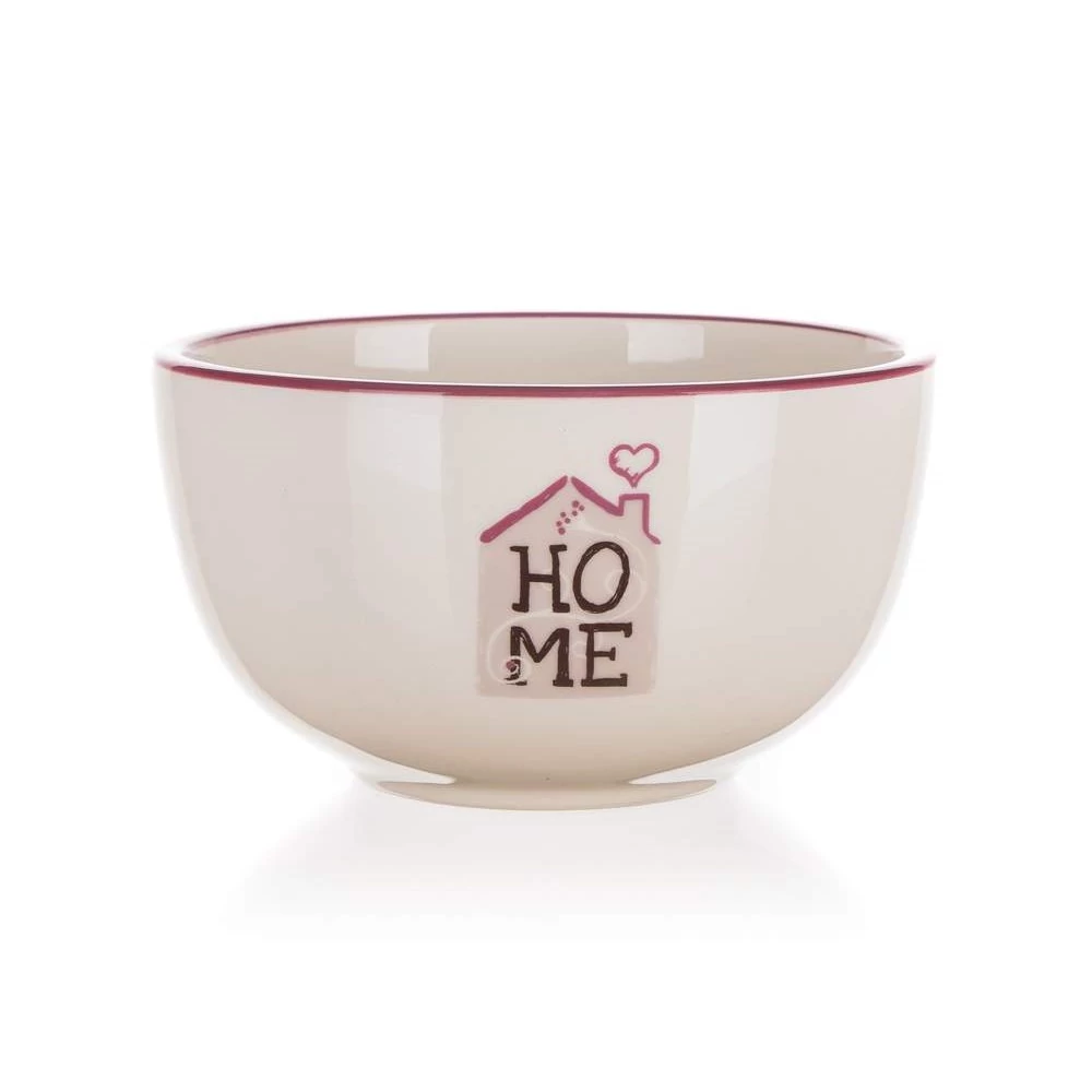 A fehér és bordó színű HOME mintás 12,5 cm-es tálka kerámiából készül.
