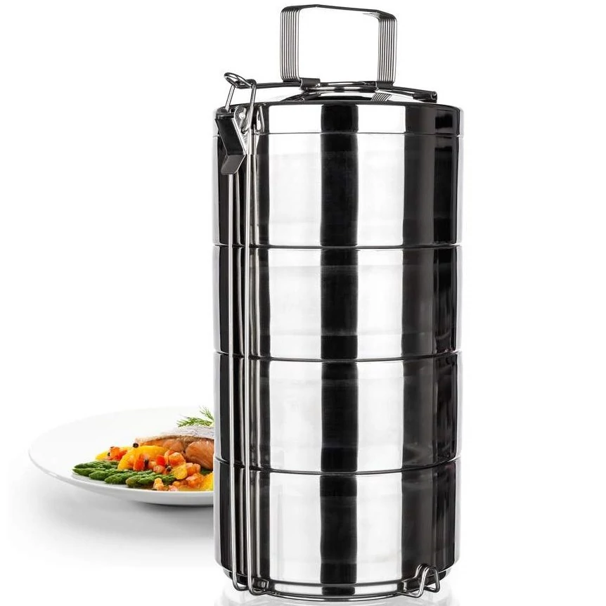 Háromrészes rozsdamentes acél AKCENT ételhordó élelmiszerek és készételek szállítására. A készlet 4 db 16 cm átmérőjű és 7.5 cm magas rozsdamentes acél edényt tartalmaz. Minden rész űrtartalma 1,1 l. A kétfalú kivitelnek köszönhetően praktikus az étel hordozás közbeni melegen tartáshoz.