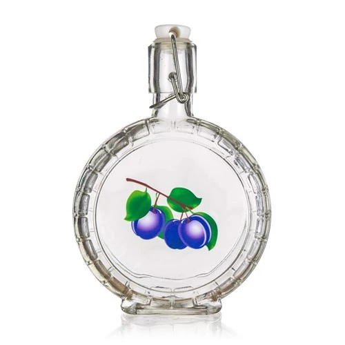 A szilva motívummal díszített 400 ml-es üveg laposüveg musthoz és alkoholos italokhoz használható. A palack hermetikusan záródó kupakkal van ellátva.